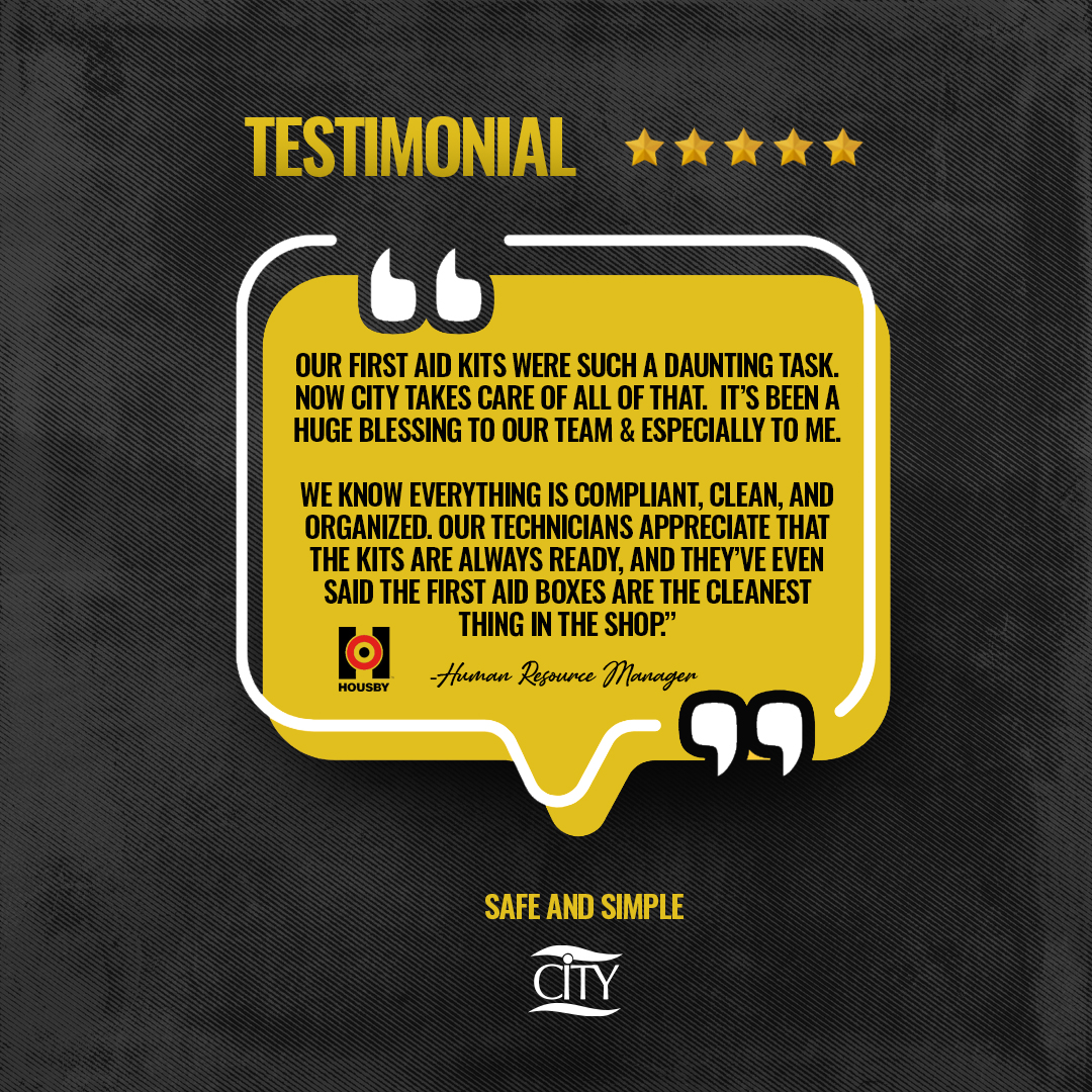 When first aid management became overwhelming for HousbyMack, CITY stepped in to simplify the process. With fully stocked, OSHA-compliant kits, responsive service, and a team that truly cares, CITY helps keep technicians safe while giving HR peace of mind.